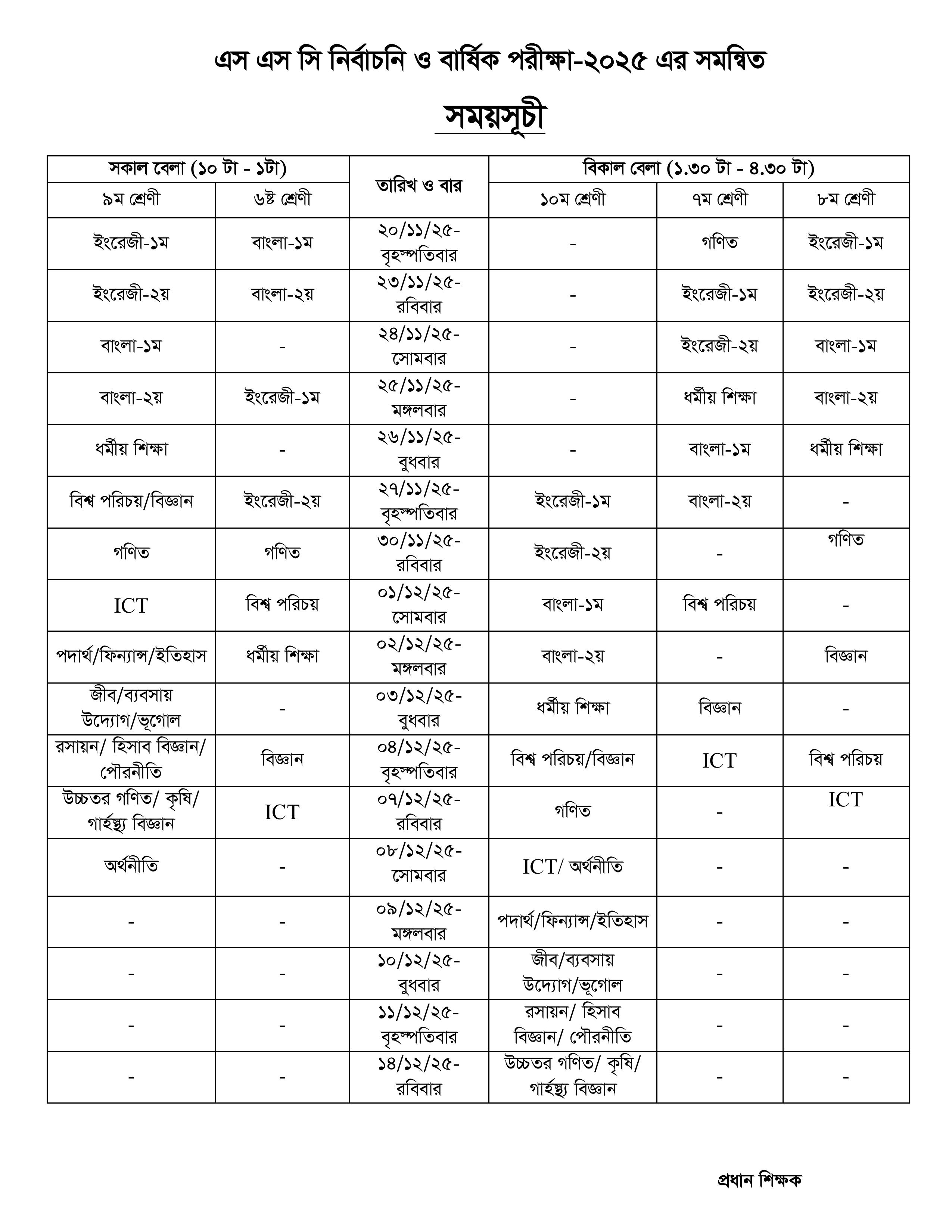 ২০২৫ সালের ষষ্ঠ হতে নবম শ্রেণীর বার্ষিক এবং এস এস সি নির্বাচনী পরীক্ষা আগামী ২০ নভেম্বর ২০২৫ ইং তারিখ হতে শুরু হবে। সকল শিক্ষার্থীকে তাদের নির্ধারিত ফি ও বকেয়া পরিশোধ পূর্বক পরীক্ষায় অংশ নিতে নির্দেশ প্রদান করা হল। বকেয়া পরিশোধ না করে কোন শিক্ষার্থী পরীক্ষায় অংশ নিতে পারবেনা।